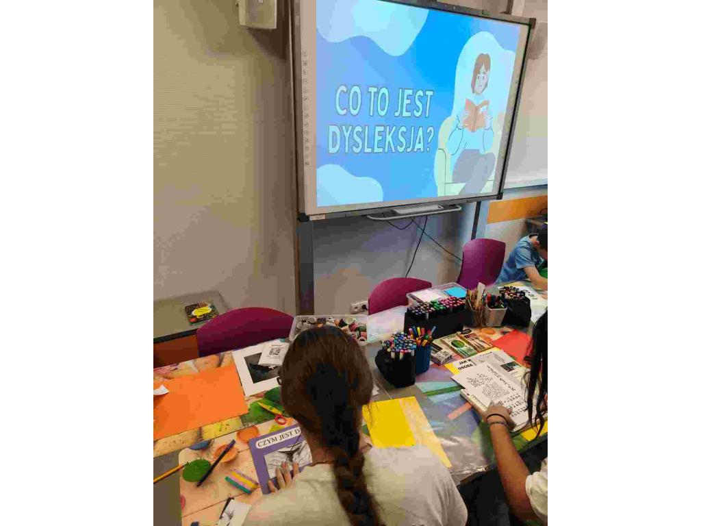 Zajęcia rozpoczęły się burzą mózgów, podczas której uczniowie dzielili się swoimi skojarzeniami i doświadczeniami związanymi z dysleksją. Następnie obejrzeli prezentację multimedialną, która przybliżyła im, czym jest dysleksja, jakie są jej przyczyny oraz jak można wspierać osoby z dysleksją w nauce. Ważnym elementem prezentacji było także omówienie mitów i faktów dotyczących dysleksji – uczniowie z zainteresowaniem odkrywali, że wiele powszechnych przekonań na ten temat nie ma nic wspólnego z rzeczywistością. W dalszej części zajęć uczniowie wzięli udział w łamigłówkach i zadaniach interaktywnych na platformie Wordwall, które pozwoliły im lepiej zrozumieć, z jakimi trudnościami mogą mierzyć się osoby z dysleksją. Następnie uczestnicy wykonali plakaty tematyczne, promujące wiedzę o dysleksji i tolerancję wobec osób z trudnościami w uczeniu się.